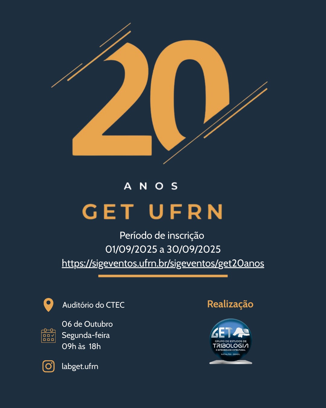 Notícia publicada em 26/09/2025Eventos FinalizadosO Grupo de Estudos de Tribologia e Engenharia Estrutural (GET/UFRN), vinculado ao Centro de Tecnologia (CT/UFRN), divulga workshop comemorativo em celebração aos 20 anos de atuação do Laboratório de Tribologia e Dinâmica (LTD). O evento acontece no dia 6 de outubro, no auditório do Complexo Tecnológico de Engenharia (CTEC/UFRN), das 9h às 18h. As inscrições estão abertas até o dia 30 de setembro e podem ser feitas na página de eventos do Sigaa.